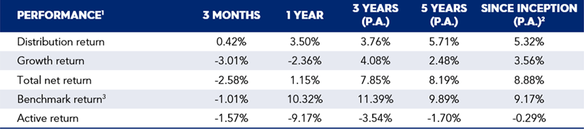 1 Performance: distribution return is the return due to distributions paid by the Fund; growth return is the return due to changes in initial capital value of the Fund, total net return is the Fund return after the deduction of ongoing fees and expenses and assumes the reinvestment of all distributions. Results greater than one are annualised.