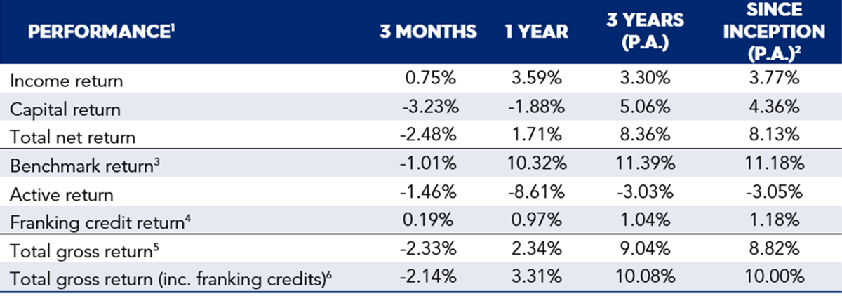 1 Income return and total net return are Fund returns after the deduction of ongoing fees and expense and assumes the reinvestment of all distributions. Results greater than one year are annualised.