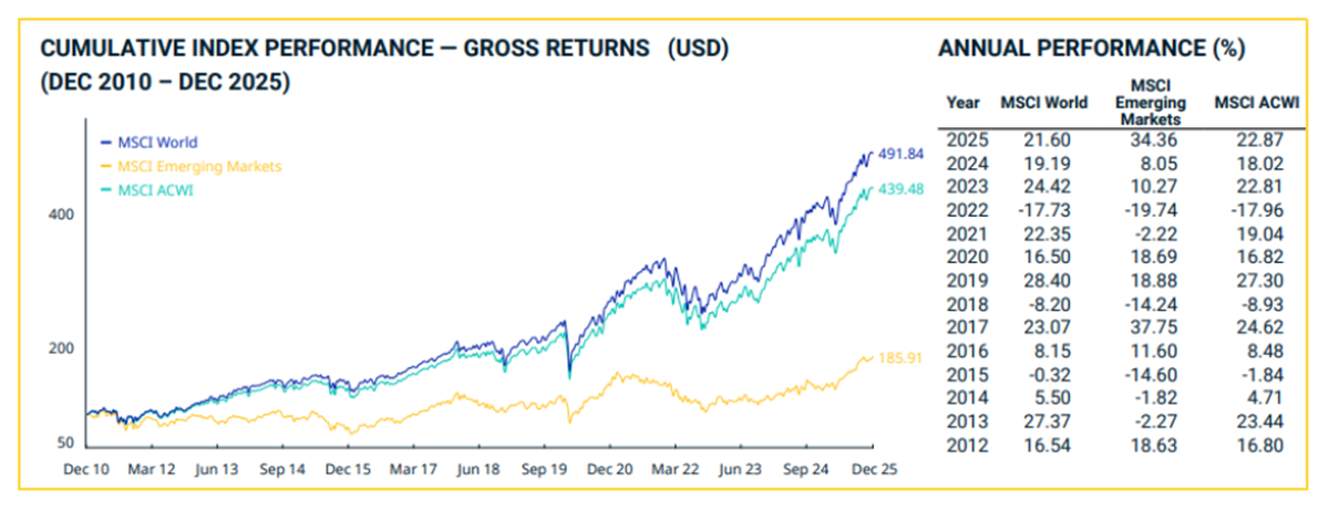 Equity returns over the past three years have been exceptionally strong, with the benchmark MSCI ACWI ETF delivering a 21.7% compound annual growth rate in USD terms during this period. Several factors have underpinned this performance: steady earnings growth, particularly among large-cap technology companies; widespread interest rate cuts by central banks in major economies; moderate global economic growth; fiscal stimulus measures; and a positive investment cycle driven by the deployment of AI infrastructure. Offsetting these positive drivers, however, have been ongoing geopolitical uncertainties and the adoption of trade protectionist policies by the U.S. administration under President Trump.