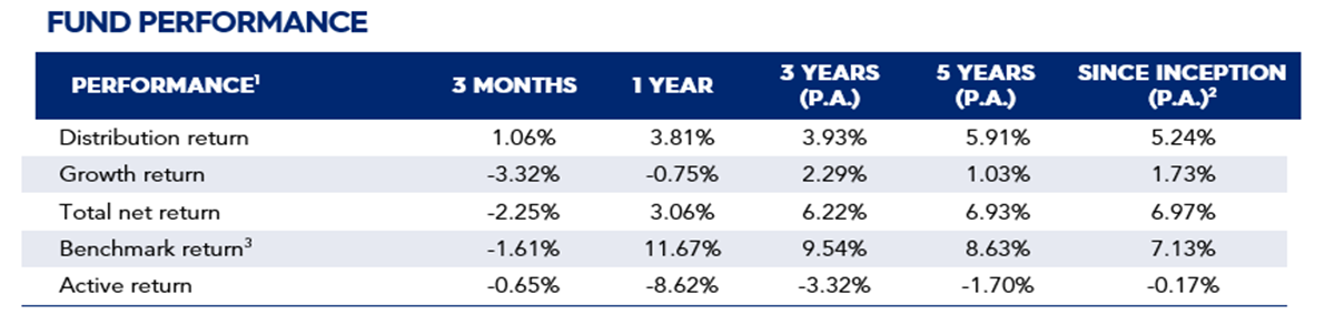 1 Performance: distribution return is the return due to distributions paid by the Fund; growth return is the return due to changes in initial capital value of the Fund, total net return is the Fund return after the deduction of ongoing fees and expenses and assumes the reinvestment of all distributions. Results greater than one are annualised.