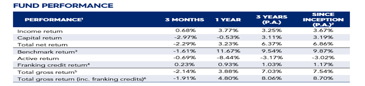 1 Income return and total net return are Fund returns after the deduction of ongoing fees and expense and assumes the reinvestment of all distributions. Results greater than one year are annualised.